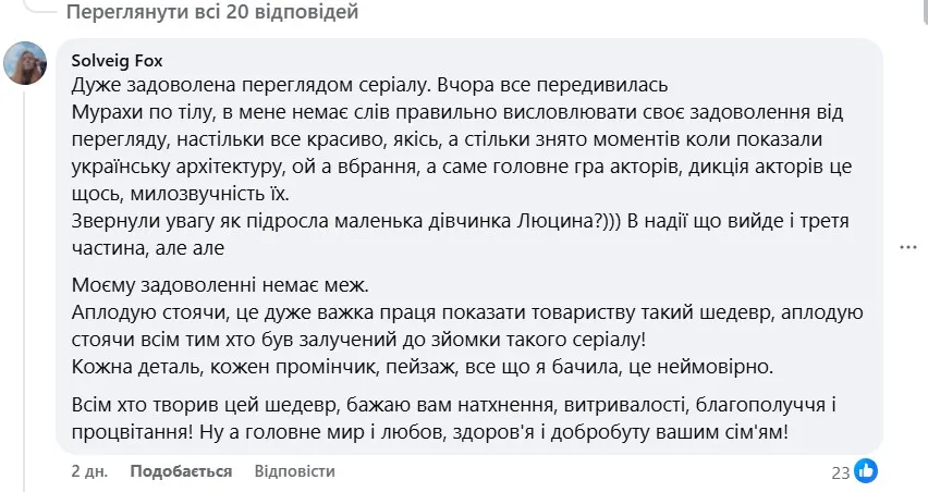 - "Дуже задоволена переглядом серіалу. Вчора передивилася все. Мурахи по тілу, у мене немає слів правильно висловити своє захоплення переглядом: усе красиво, стільки моментів, де показали українську архітектуру, вбрання, а найголовніше – гра акторів. Дикція, милозвучність – це щось неймовірне. Звернули увагу, як підросла маленька дівчинка Люцина? Сподіваюся, вийде і третя частина, але… Моєму задоволенню немає меж. Аплодую стоячи! Це дуже важка праця – показати глядачам такий шедевр. Кожна деталь, кожен промінчик, пейзаж – усе, що я бачила, неймовірно."