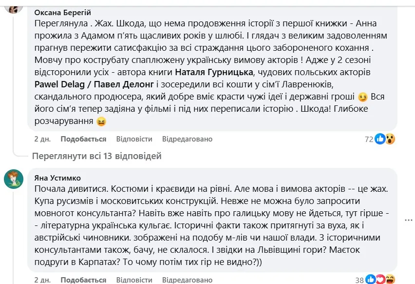 - "Переглянула. Жах. Шкода, що немає продовження історії з першої книги – Анна прожила з Адамом п'ять щасливих років у шлюбі. І глядач із великим задоволенням прагнув би пережити сатисфакцію за всі страждання цього забороненого кохання. Мовчу про кострубату, спаплюжену українську вимову акторів! Адже у другому сезоні відсторонили всіх – автора книги Наталю Гурницьку, чудових польських акторів – і зосередили всі кошти у сім'ї Лавренюків, скандального продюсера, який добре вміє красти чужі ідеї й державні гроші. Вся його сім'я тепер залучена до фільму, і під них переписали історію. Шкода! Глибоке розчарування."