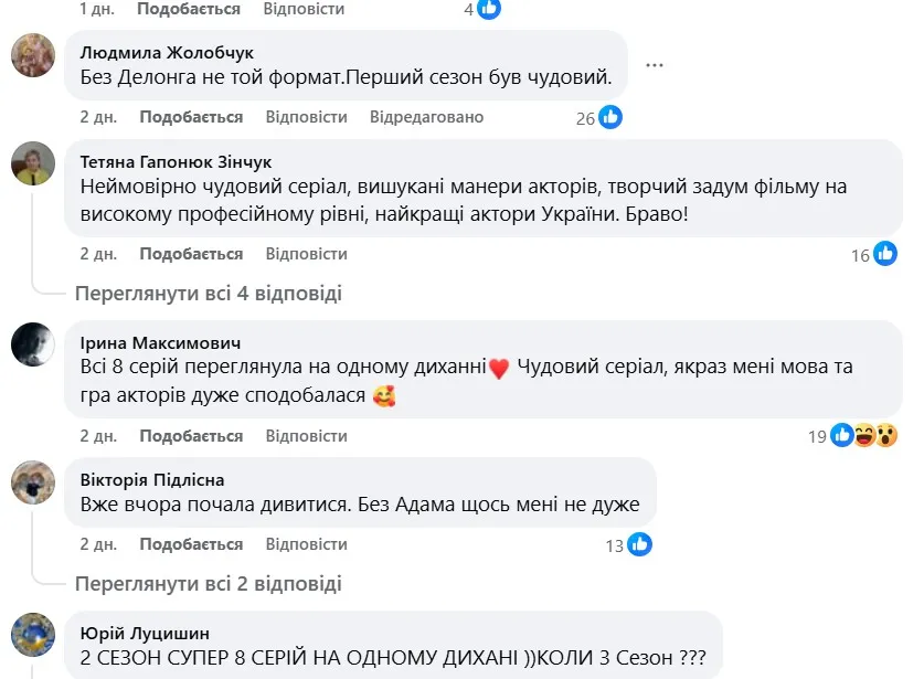 - "Всі 8 серій переглянула на одному диханні. Чудовий серіал, мені дуже сподобалися мова та гра акторів."