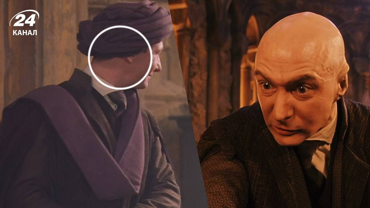 - У першій частині професор Квірел постійно ходив з обмотаною головою. В один із кадрів потрапило, як з-під його головного убору визирає волосся. А от у фінальній сцені професор був лисий.