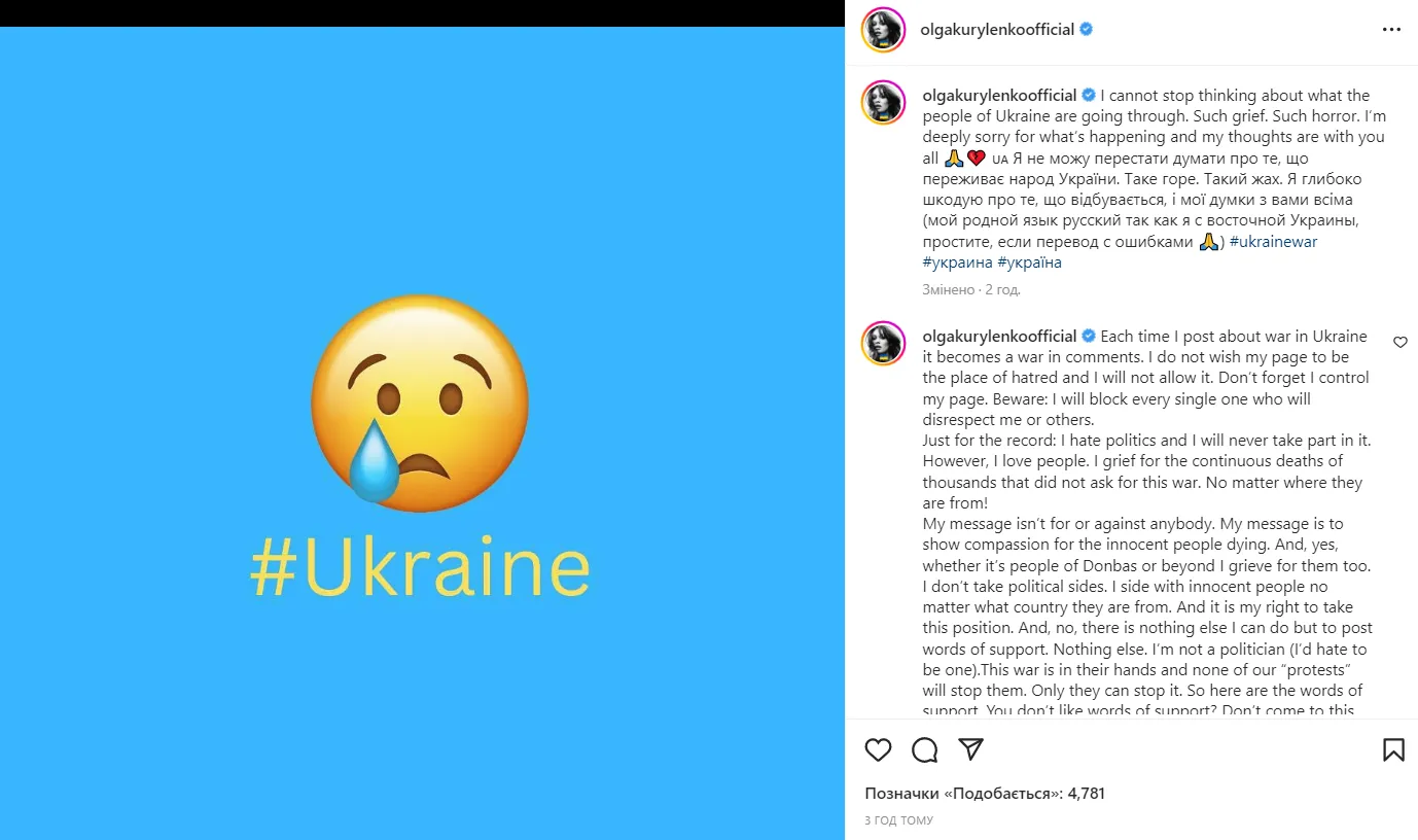 Крім цього доповнила, що щоразу, коли пише про війну в Україні, починається війна у коментарях. "Я не хочу, щоб моя сторінка була місцем ненависті й не дозволю цього". Вона попередила, що заблокує кожного, хто виявить неповагу до неї чи її свідомих підписників.