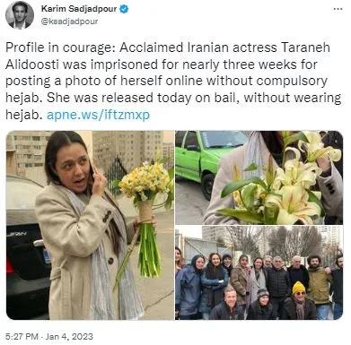 Таране Алідусті звільнили з-під арешту / Скриншот допису з твітеру