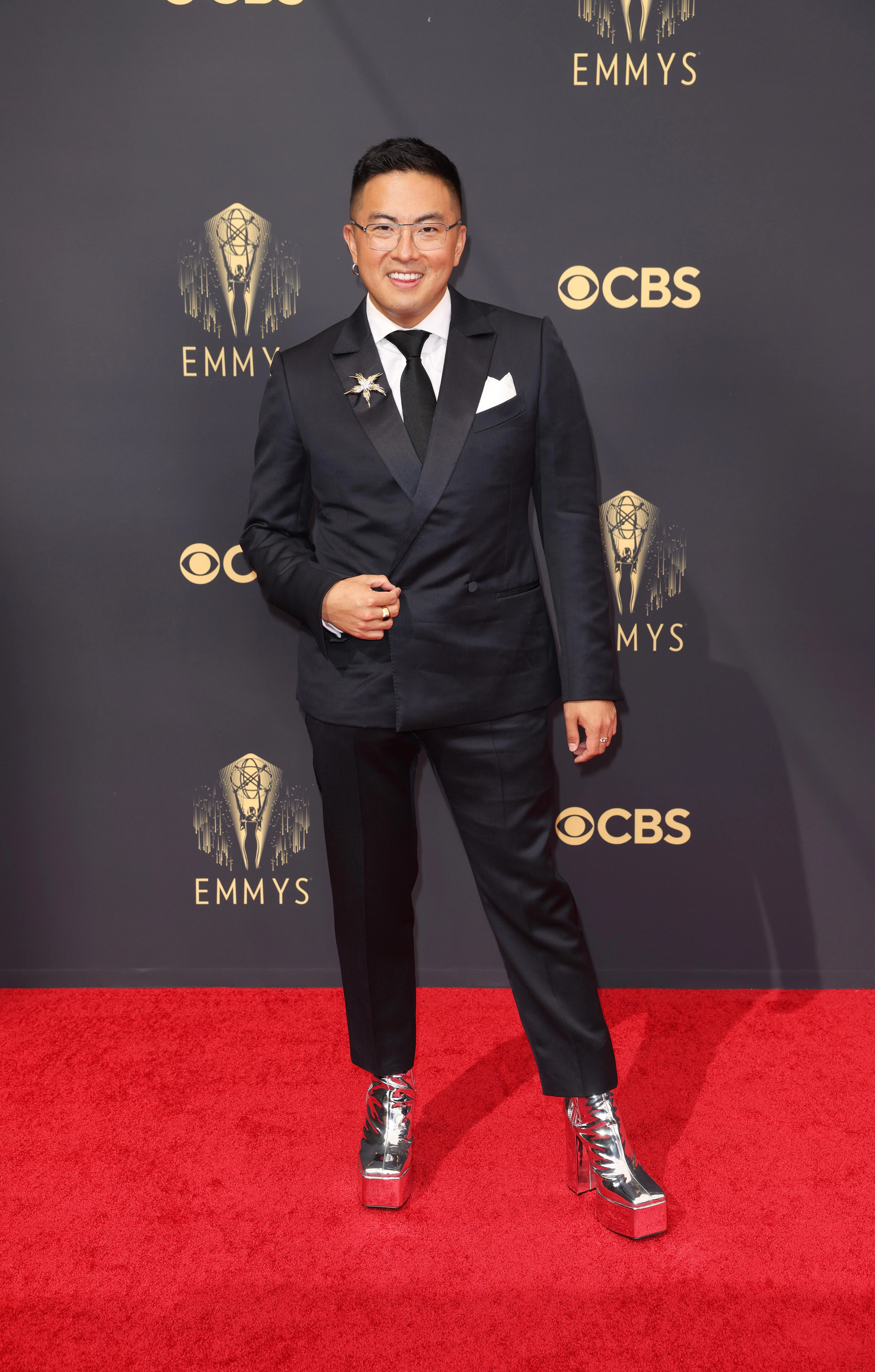 Боуэн Янг выбрал сдержанный костюм, но подчеркнул образ серебряными туфлями на платформе, похожими на обувь Дэвида Боуи.