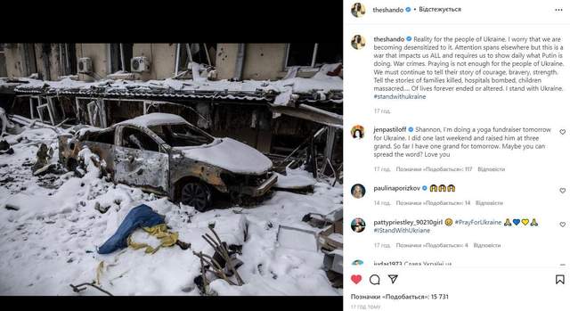 инстаграм Шеннен ДоэртиВ Украине идет 17-й день войны. Наши защитники мужественно удерживают оборону городов, а мировые знаменитости продолжают поддерживать украинцев. В частности, Шеннен Доэрти еще раз призвала рассказывать правду об Украине и остановить войну.