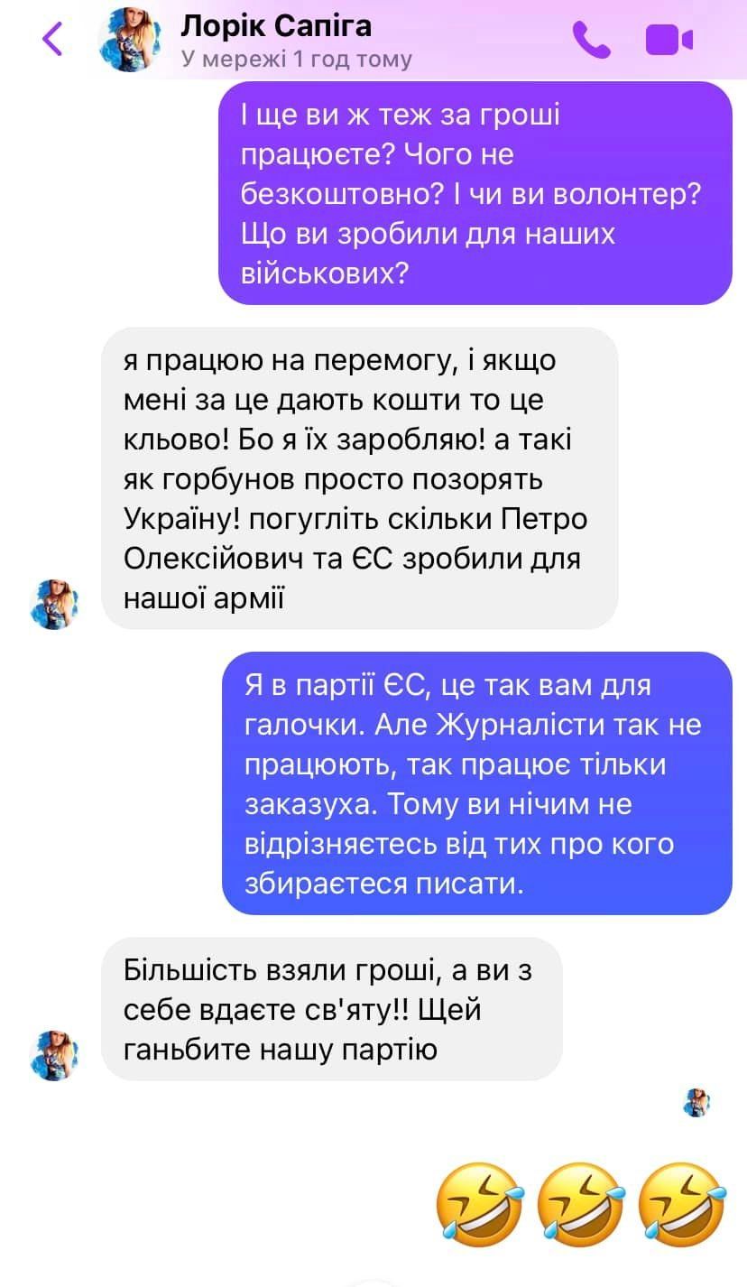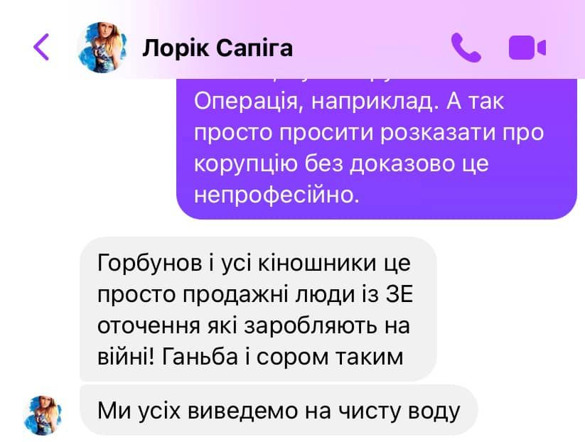Олеся сообщила, что получила довольно странное сообщение от неизвестного лица, которое "не понимается ни в политике, ни в культуре, ни в кино". Женщина писала режиссеру о Горбунове, который, по ее словам, "позорит Украину и зарабатывает на войне".