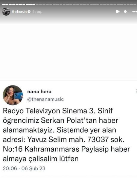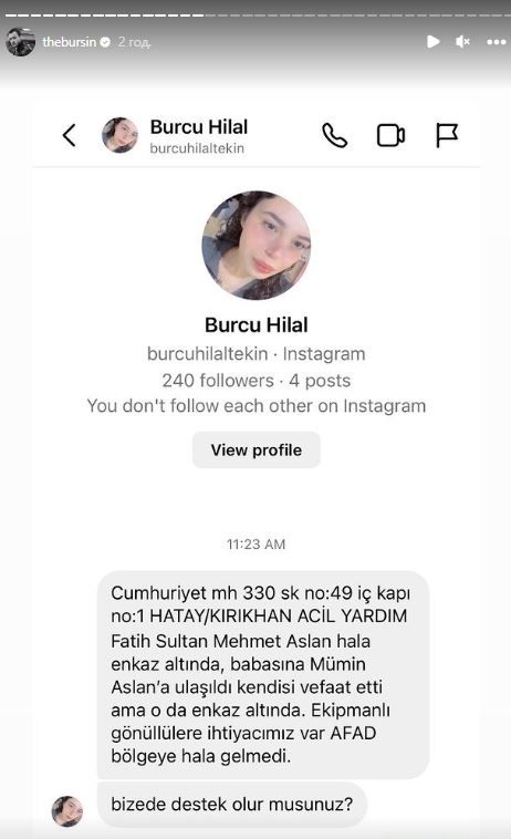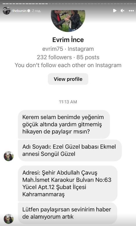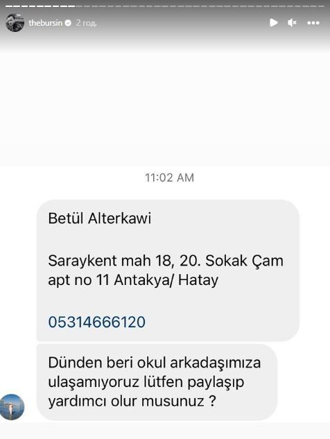 В дірект до актора звертаються чимало жителів Туреччини, щоб поширити інформацію про їхніх знайомих та родичів: "8 місяців вагітності, немає допомоги, вони не могли вибратися. Видно руку Севде. Поширте терміново".