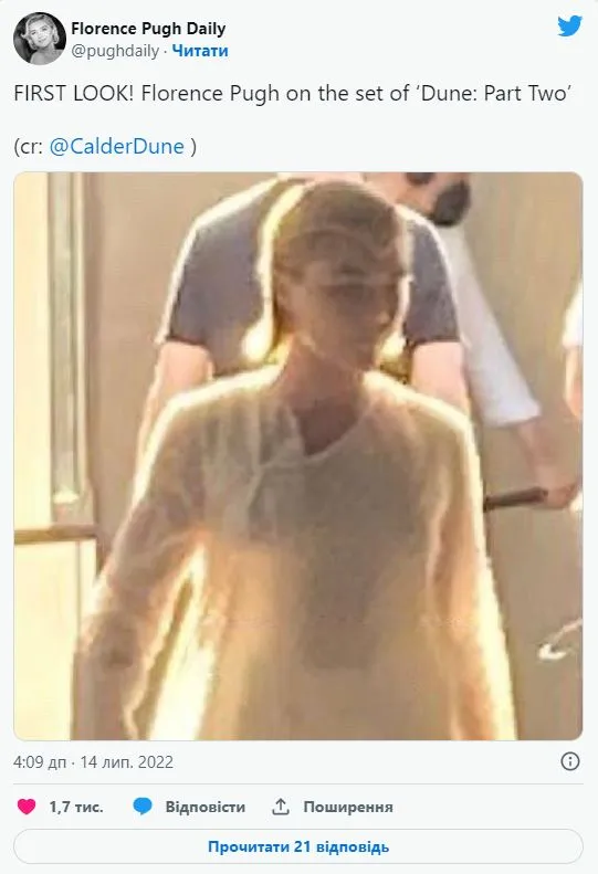 Раніше у твітері фан-акаунта Florence Pugh Daily з’явилося перше зображення із Флоренс П’ю під час офіційних зйомок "Дюни 2". Зірка зіграє у картині роль принцеси Ірулан Корріно з Будинку Корріно. Знімок дуже поганої якості, проте образ героїні можна розглянути.